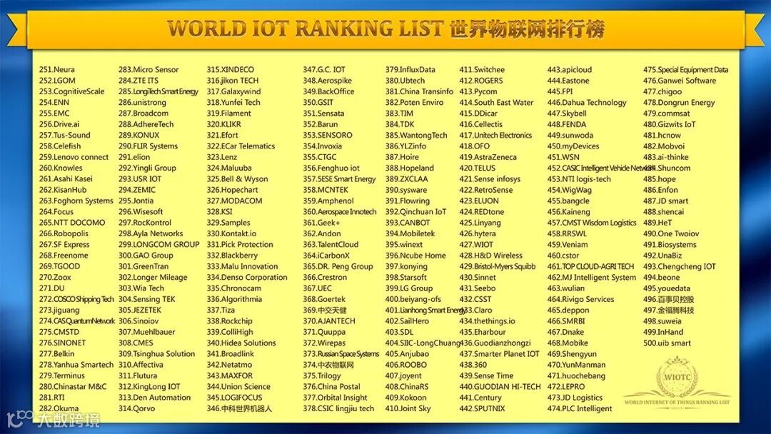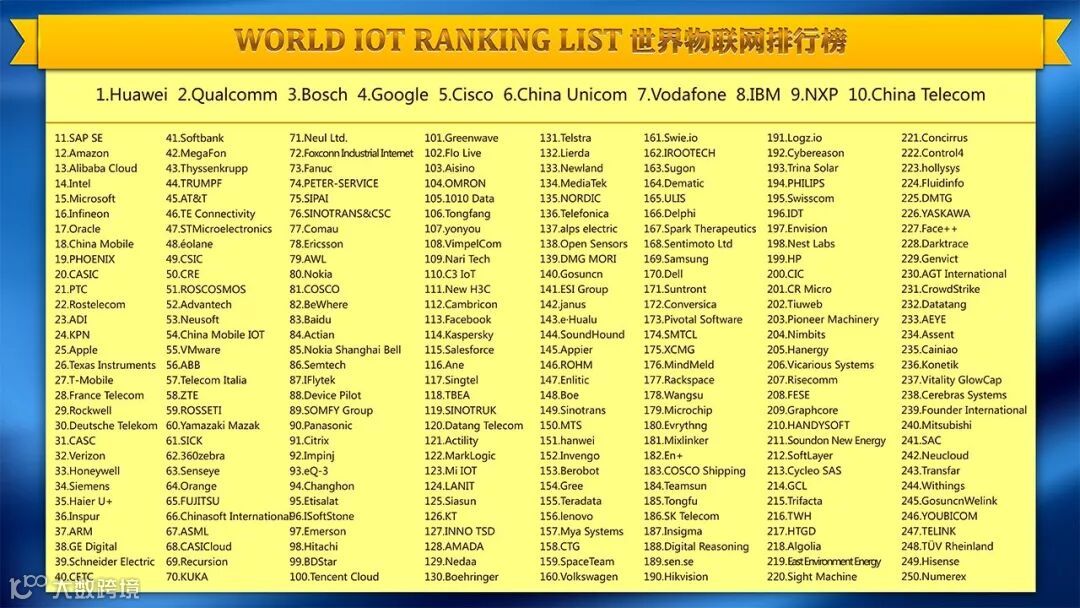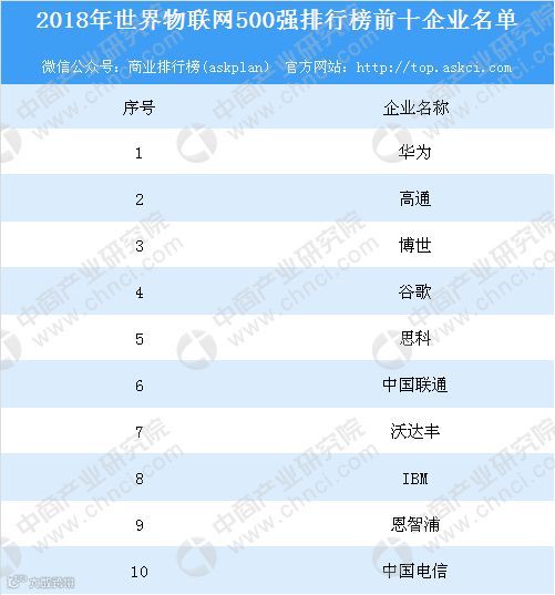 2018年10月20-21日,2018世界物联网大会在北京国家会议中心召开,本次大会中公布了2018世界物联网排行榜500强企业。据榜单显示,进入榜单前十的企业分别是:华为、高通、博世、谷歌、思科、中国联通、沃达丰、IBM、恩智浦和中国电信。