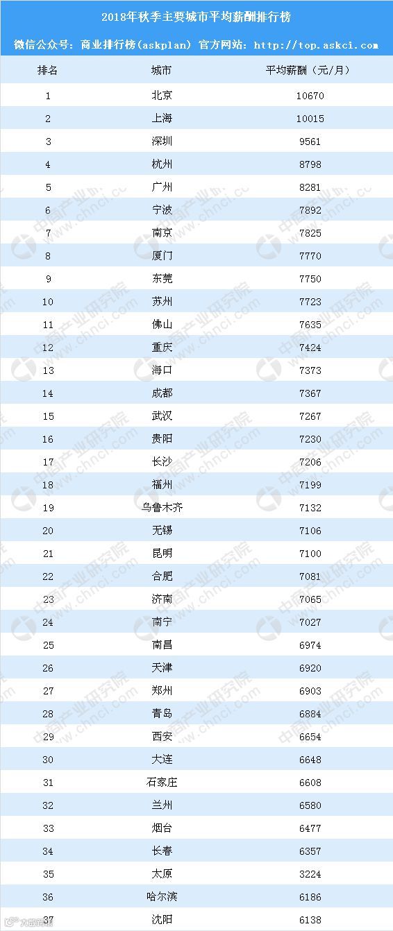 9月29日,智联招聘发布《2018年秋季中国雇主需求与白领人才供给报告》,数据显示,2018年秋季,全国37个主要城市的平均招聘月薪为7850元,环比上升0.2%,同比涨幅为3.3%。其中,北京平均最高,为10670元。上海平均薪酬突破万元,达到10015元。深圳排名第三,平均薪酬9561元。杭州和广州平均薪酬分别为8798元、8281元。