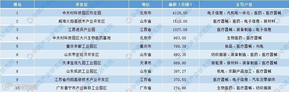 具体来看,位于北京市的中关村科技园区亦庄园面积最大,达4128公顷,主导产业包括电子信息、光机电一体化、医药、医疗器械。其次为山东省的威海火炬高技术产业开发区、江西省的江西进贤产业园、北京市的中关村科技园区大兴生物医药基地、重庆市的重庆丰都工业园区。以上开发区面积排名全国前五,合计达8388.44公顷。