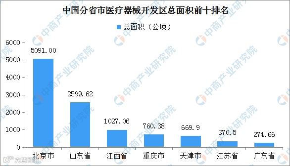 整体来看,分省市医疗器械开发区面积依次为北京市、山东省、江西省、重庆市、天津市、江苏省、广东省。