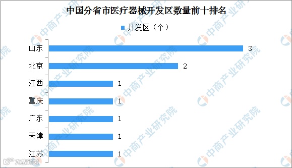 按开发区数量来看,拥有医疗器械开发区数量最多的省市为山东省,开发区数量为3个;北京市位列第二,拥有医疗器械开发区数量为2个;其他省市各为1个。