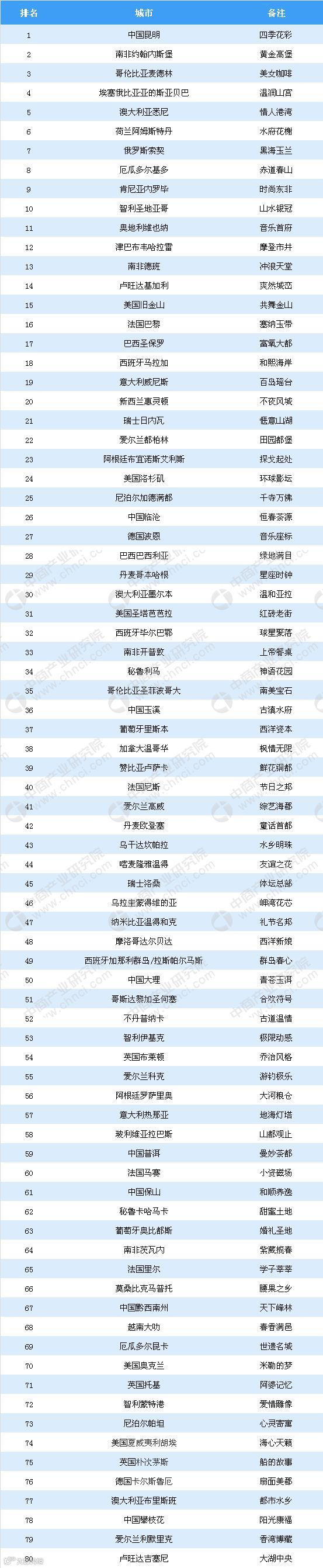 位列本年度前十佳世界春城的依次为中国昆明、南非约翰内斯堡、哥伦比亚麦德林、埃塞俄比亚亚的斯亚贝巴、澳大利亚悉尼、荷兰阿姆斯特丹、俄罗斯索契、厄瓜多尔基多、肯尼亚内罗毕、智利圣地亚哥。中国上榜城市分别为云南省昆明市、临沧市、玉溪市、大理州、普洱市、保山市与贵州省黔西南州、四川省攀枝花市。2018世界春城80佳排名如下: