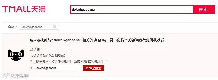 天猫已经无法通过关键字“Dolce&Gabbana”、“杜嘉班纳”等搜索到相关商品。