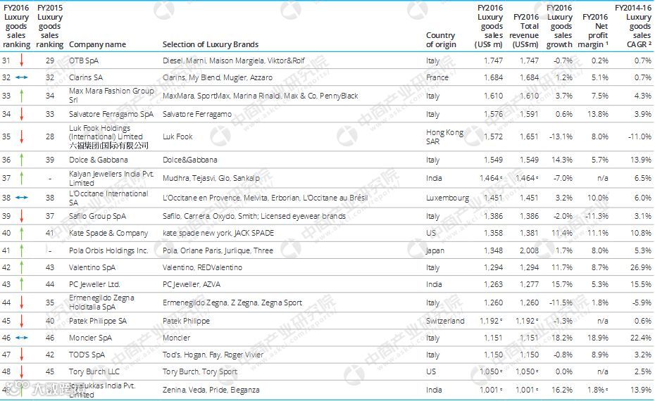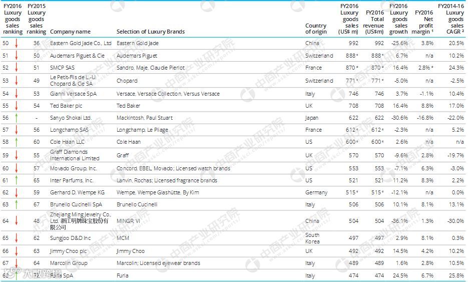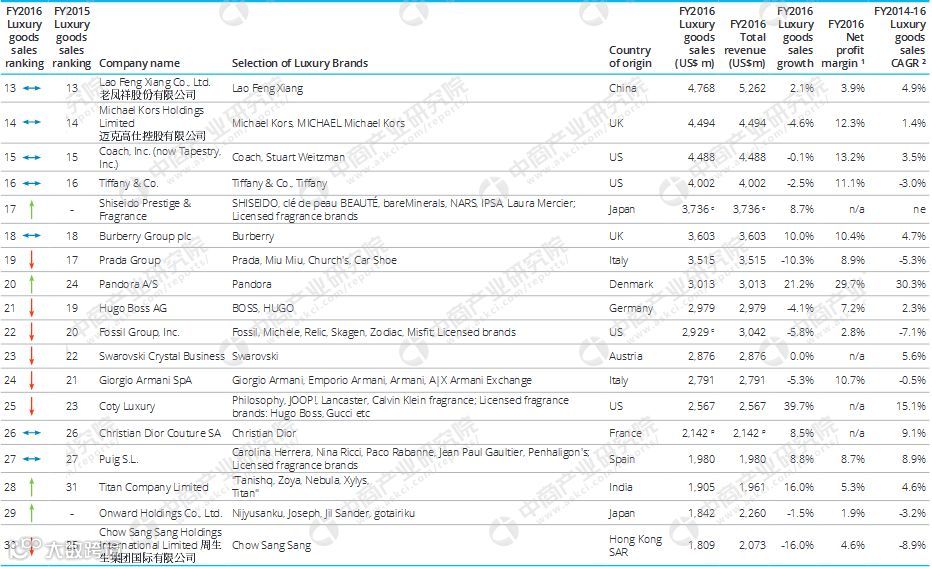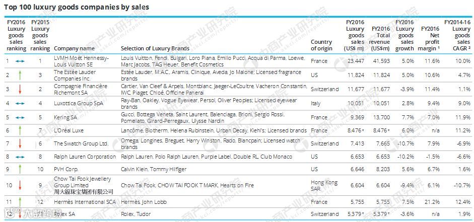 2018年全球奢侈品公司百强榜单前十排名分别是法国奢侈品集团LVMH、雅诗兰黛集团(EstéeLauderCompaniesInc)、瑞士奢侈品巨头历峰集团(RichemontSA)、意大利眼镜巨头LuxotticaGroup(陆逊梯卡)、法国Kering(开云)集团、法国美妆巨头L’Oréal(欧莱雅)集团、斯沃琪集团、美国时尚集团RalphLaurenCorporation、美国时尚零售集团PVHCorp和中国香港珠宝商周大福集团(ChowTaiFook)。值得关注的是,周大福集团今年排名下降一位至第十位,销售额同比下滑9.4%。