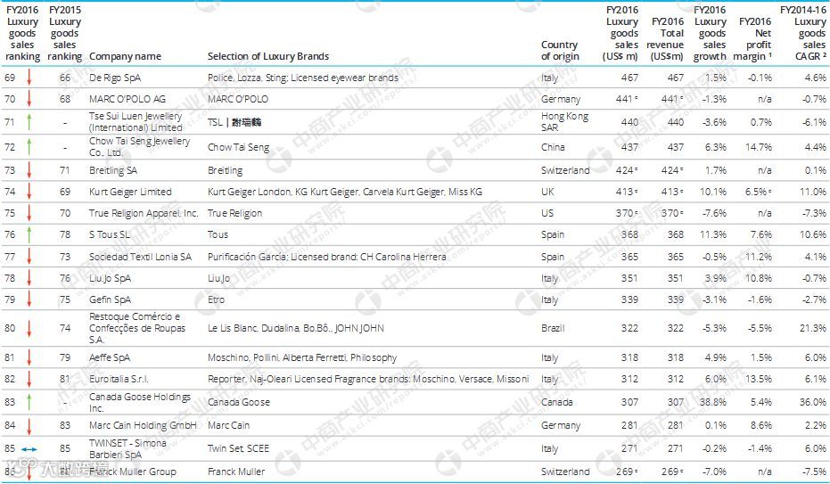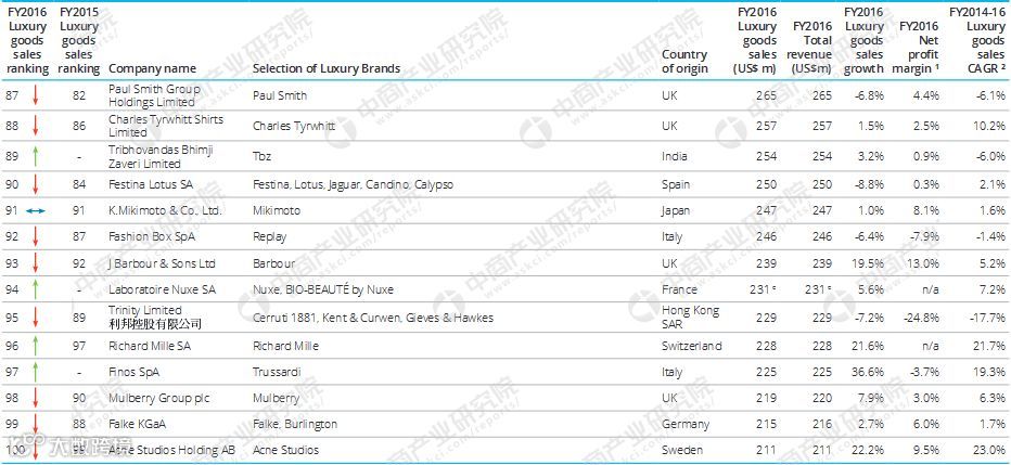 据数据显示:截止2017年6月30日的2016/2017财年,全球排名前100强的奢侈品公司总销售额达2166亿美元;平均每家公司的销售额约22亿美元;按不变汇率计,这些公司的销售额增幅为1%,按当前汇率计,增幅为6.8%;其中排名前十的10家奢侈品公司贡献了47%的销售额。