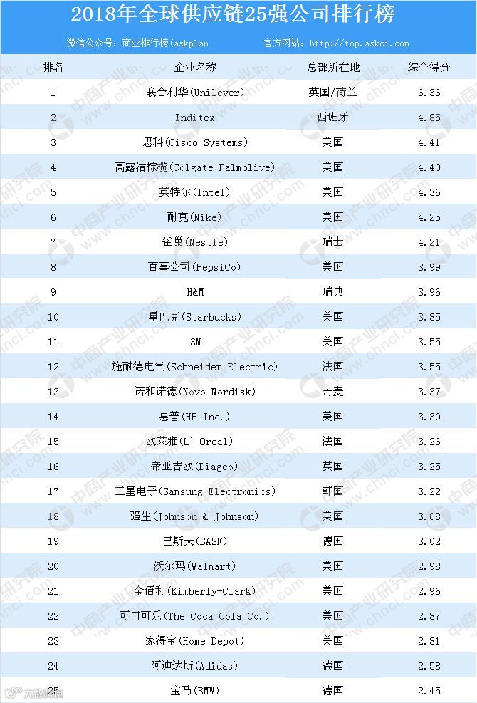 近日,研究和咨询公司Gartner公布2018年全球供应链25强公司排名(The Gartner Supply Chain Top 25 for2018)。据榜单显示,进入榜单前十的企业分别是:联合利华(Unilever)、Inditex、思科(Cisco Systems)、高露洁棕榄(Colgate-Palmolive)、英特尔(Intel)、耐克(Nike)、雀巢(Nestle)、百事公司(PepsiCo)、H&M以及星巴克(Starbucks)。其中,联合利华以综合得分6.36分位列榜首,据悉,今年是联合利华连续第三年获得榜单的第一名。其次,Inditex位列第二,综合得分为4.85分。