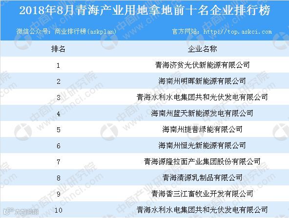 据专业的产业拿地策划规划咨询机构中商产业研究院产业地产情报库监测数据显示,2018年8月,青海产业用地拿地企业前10名分别为:青海济贫光伏新能源有限公司、海南州明晖新能源有限公司、青海水利水电集团共和光伏发电有限公司、海南州蓝天新能源发电有限公司、海南州捷普绿能有限公司、海南州恒光新能源有限公司、青海源隆拉面产业集团股份有限公司、青海清源乳制品有限公司、青海香三江畜牧业开发有限公司、青海水利水电集团共和光伏发电有限公司;其中前10名企业用地拿地总计面积约437.17公顷。