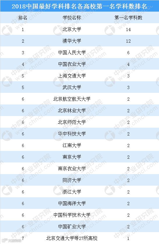 11月1日,软科正式发布2018“中国最好学科排名”。排名榜单包括93个一级学科,共有460所高校的4999个学科点上榜。其中北京大学是在各学科中夺冠最多的高校,共有14个学科名列榜首。清华大学紧随其后,在12个学科中摘得桂冠。中国人民大学有6个学科排名全国第一,中国农业大学有4个学科位列全国第一。上海交通大学、武汉大学也有优异表现,在3个学科中排名第一。全国有第一名学科的高校一共是45所。