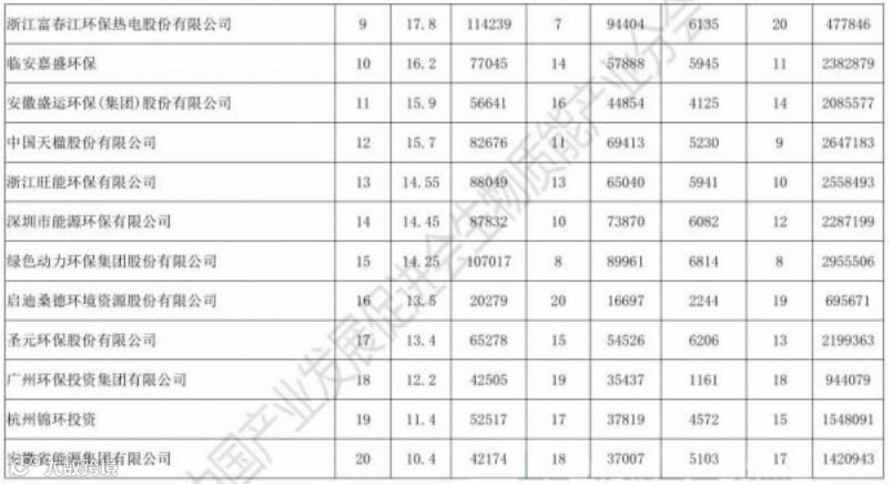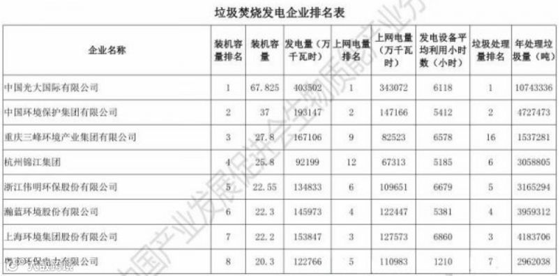 会上并公布了全国各省农林生物质发电十强排名、垃圾焚烧发电企业排名等榜单。据垃圾焚烧发电企业排行榜显示,垃圾焚烧发电十强企业分别是:中国光大国际有限公司、中国环境保护集团有限公同、重庆三峰环境产业集团有限公司、杭州锦江集团、浙江伟明环保股份有限公司、瀚蓝环境股份有限公司、上海环境集团股份有限公司、粤丰环保电力有限公司、浙江富春江环保热电股份有限公司以及临安嘉盛环保。其中,中国光大国际有限公司以403502万千瓦时的发电量位列榜首。同时,中国光大国际有限公司也是垃圾焚烧装机容量、上网电量以及垃圾年处理量均第一的企业。以下是垃圾焚烧发电企业排名的详细情况:
