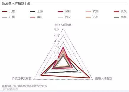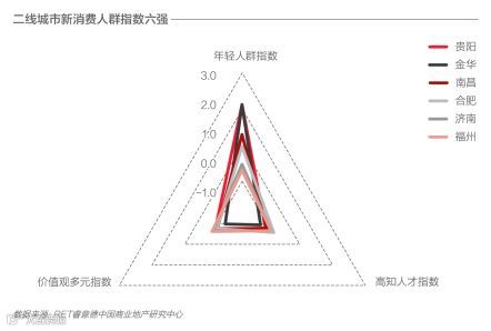 报告认为,二线城市在进行人才大战的同时,其实也是在争夺接受新鲜事物、拥抱新科技的新一代消费者。在新消费人群指数上,分数靠前的二线城市均呈现出年轻人群多,但高知人才少、价值观多元化程度低的结构特点,其中金华(楼盘)、贵阳尤为凸显。