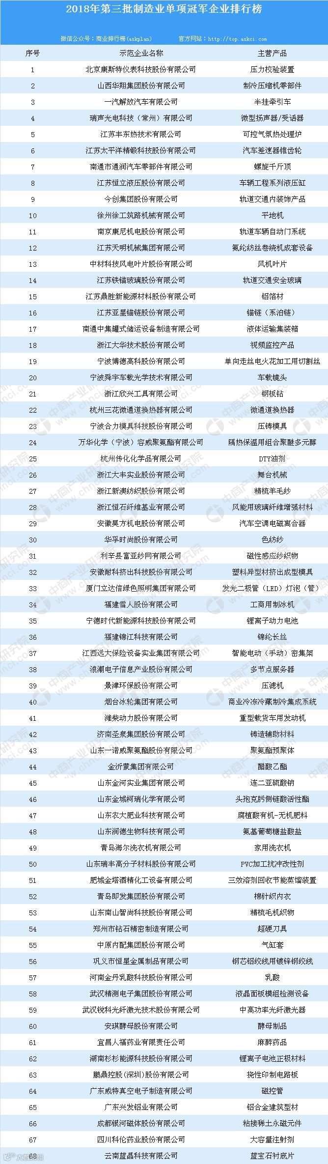 招商资源库近日,为培育制造业全球单项冠军,提升企业专业化能力和水平,突破制造业关键领域短板,推动产业整体迈向全球价值链中高端,促进我国制造业高质量发展,工信部等两部门发布第三批制造业单项冠军企业和单项冠军产品名单,其中,单项冠军企业共有68家。以下是详细榜单: