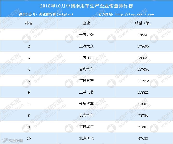 企业方面,2018年10月乘用车生产企业销量前十排名依次为一汽大众、上汽大众、上汽通用、吉利汽车、东风日产、上通五菱、长城汽车、长安汽车、东风本田、北京现代。其中,10月乘用车企业销量第一的为一汽大众,销量达175231辆。