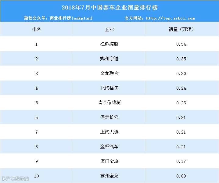 7月,上述十家企业共销售2.55万辆,占客车销售总量的79.44%。