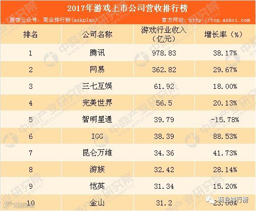 近日,超过30家游戏上市公司陆续发布了2017年度的业绩报告。据统计,截止2018年4月13日,2017年上市游戏公司中营收排名前十的企业分别是:腾讯、网易、三七互娱、完美世界、智明星通、IGG、昆仑万维、游族、恺英、金山。其中,腾讯、网易两家公司在营收和净利润等方面继续领跑,两家企业2017年度游戏方面的营收总和超过了1340亿元,其中腾讯2017年游戏收入近千亿元。在腾讯网易两大巨头之后的第二梯队争夺较为激烈,位居3至10名的游戏公司2017年的游戏收入也都超过了30亿元。