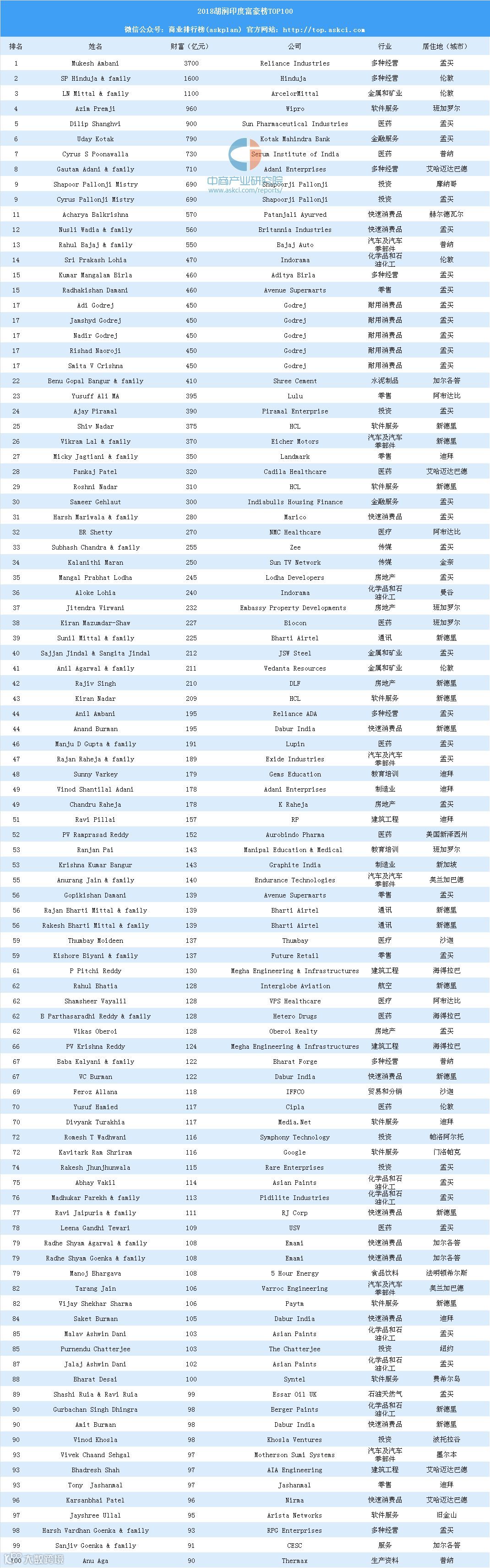 从区域来看,孟买成为印度富豪的聚集地,有233位居住在这座城市;新德里和班加罗尔分别有163位和70位。艾哈迈达巴德上榜富豪有48位,海得拉巴上榜富豪有46位.