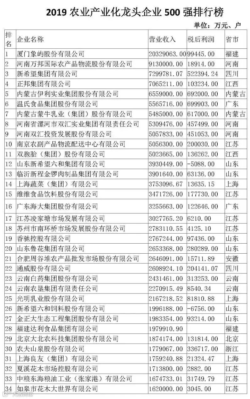 近日,2019农业产业化龙头企业500强榜单出炉。据悉,此榜单的农业产业化龙头企业评价指标为营业收入,即按照2017年企业营收额进行排名,全国31个省(市、区)参加排名。