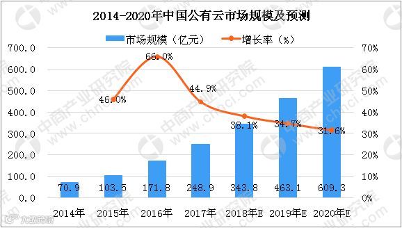在公有云市场方面,2014年以来,中国公有云市场高速发展,2014-2017年市场规模增长超4倍,复合年增长率为,随着云计算产业垂直行业的纵深场景化,中国云计算市场规模将保持高速发展,预计2020年市场规模将有望突破600亿元。