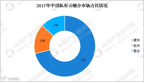 在细分市场中,2017年私有云市场规模硬件市场占比为71%,软件占比为16%,服务占比为13%。随着硬件设备的标准化程度和软件异构能力的不断提升,软件和服务市场规模也将持续增长。