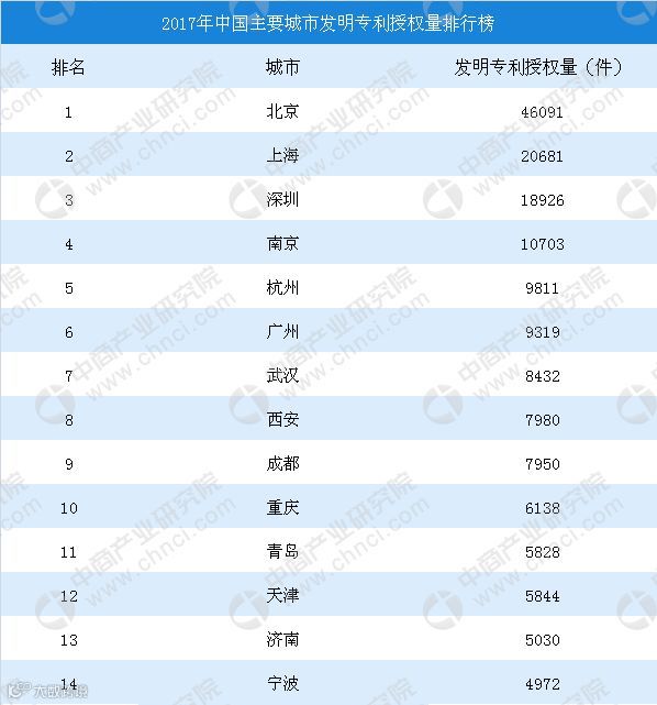 在2017年主要城市发明专利授权量排行榜中,北京市排名第一,发明专利授权量为46091件;其次为上海,发明专利授权量为20681件;排名第三的是深圳,发明专利授权量为18926件,其后分别为南京、杭州、广州、武汉、西安、成都、重庆、青岛、天津、济南以及宁波。