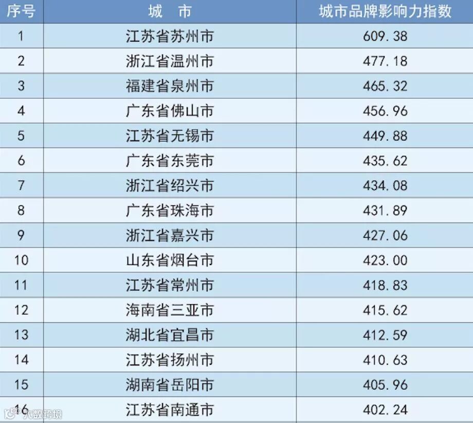 由人民日报社、中国品牌建设促进会指导的“2018中国城市大会暨中国城市品牌评价排名试发布”成功举办。根据财政部重大经济类专项国家品牌价值提升工程和《品牌评价城市》(GB)国家标准,大会首次试发布中国城市品牌(地级市)综合分值居前100名的城市。前十分别为:苏州市、温州市、泉州市、佛山市、无锡市、东莞市、绍兴市、珠海市、嘉兴市、烟台市。