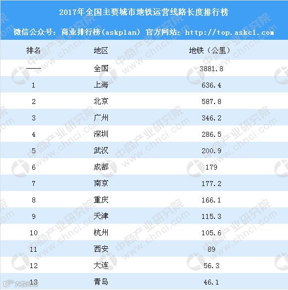 2017年全国轨道交通运营线路长度5021.7公里,其中地铁3881.8公里。其中,上海地铁运营线路最长,共计636.4公里,北京排名第二,共计587.8公里。广州和深圳排名第三和第四,地铁运营线路346.2公里、286.5公里,武汉排名第五,地铁运营线路200.9公里。地铁运营线路长度超100公里的城市还有成都、南京、重庆、天津、杭州。
