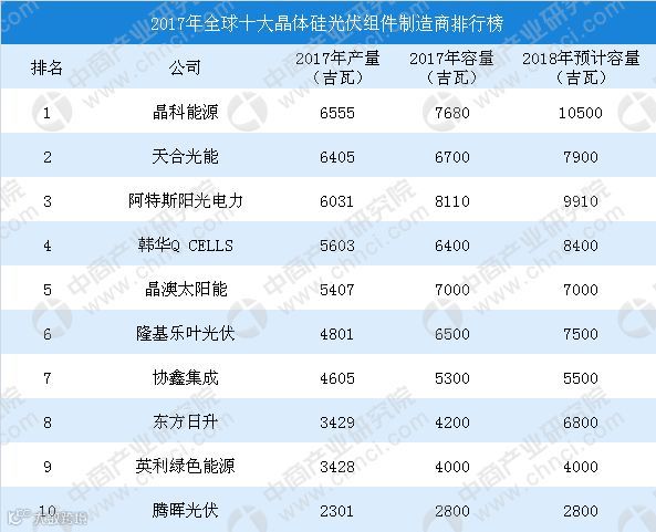 日前,GTMResearch发布2017年全球十大晶体硅光伏组件制造商排行榜,报告数据显示,2017年全球最大晶体硅光伏组件制造商为晶科能源,产量超过6.5吉瓦,同比增长24.2%;其次为天合光能,2017年产量为6.4吉瓦,同比增长23.5%;排名第三的是阿特斯阳光电力,2017年晶体硅光伏组件产量达到6.0吉瓦,与2016年的4.3吉瓦增长了40.8%。其后分别为韩华QCELLS、晶澳太阳能、隆基乐叶光伏、协鑫集成、东方日升、英利绿色能源以及腾晖光伏。