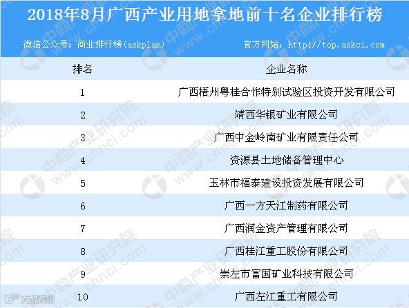 据专业的产业拿地策划规划咨询机构中商产业研究院产业地产情报库监测数据显示,2018年8月,广西产业用地拿地企业前10名分别为:广西梧州粤桂合作特别试验区投资开发有限公司、靖西华银矿业有限公司、广西中金岭南矿业有限责任公司、资源县土地储备管理中心、玉林市福泰建设投资发展有限公司、广西一方天江制药有限公司、广西润金资产管理有限公司、广西桂江重工股份有限公司、崇左市富国矿业科技有限公司和广西左江重工有限公司;其中前10名企业用地拿地总计面积约181.5公顷。