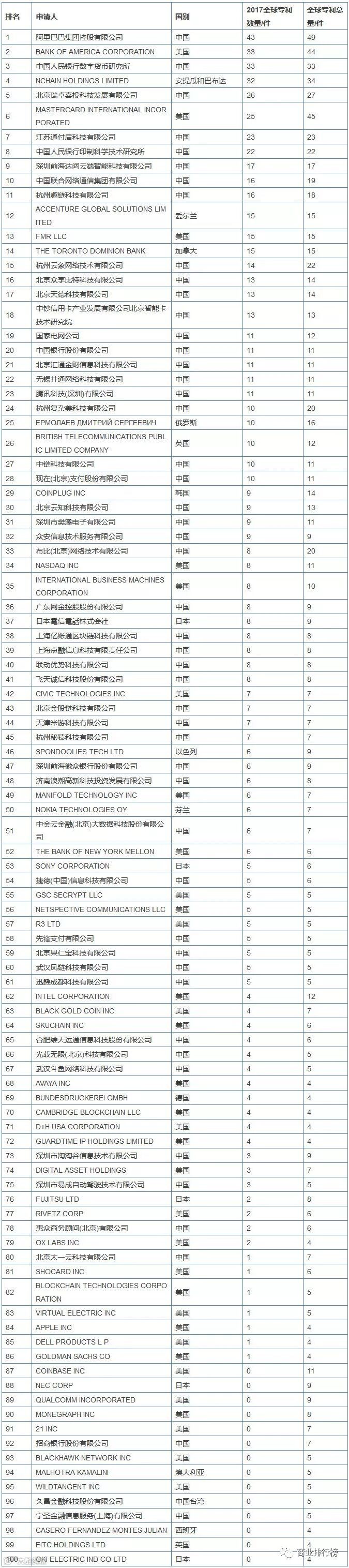 在2017年全球区块链企业专利排行榜TOP100中,阿里巴巴2017专利数量排名第一,专利数为43件;美国银行排名第二,2017年专利数为33件;中国人民银行数字货币研究所位列第三,国内排名仅次于阿里巴巴。