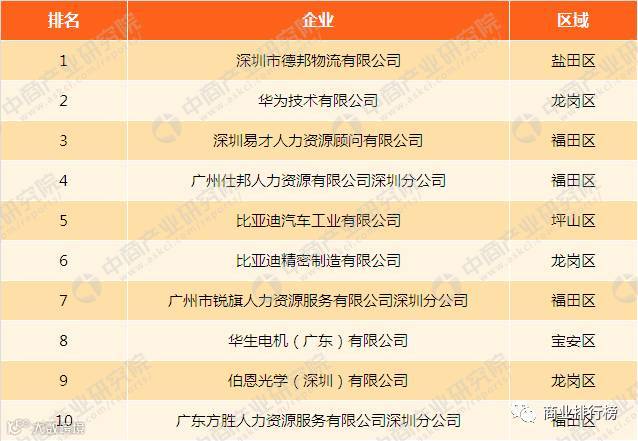 据中国领先产业咨询服务机构中商产业研究院发布的一项数据深圳企业用工人数数据显示,截止2017年10月,以参加医疗保险的用工人数为基准(以独立的法人机构为准),深圳市德邦物流有限公司用工人数排在各公司首位;前100名用工人数中,超过1万人的用人单位有27家,其中人力资源服务公司就达9家。从区域分布来开,百强用工企业总部主要集中宝安和福田区。