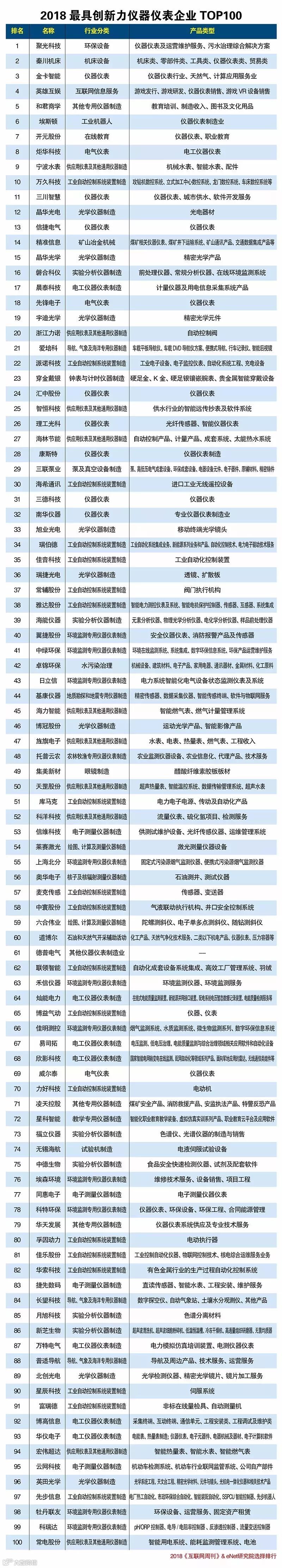 近日,2018最具创新力仪器仪表企业排行榜出炉。据榜单显示:进入榜单前十的企业分别是:聚光科技、秦川机床、金卡智能、英雄互娱、和君商学、埃斯顿、开元股份、炬华科技、宁波水表、万久科技。其中,聚光科技位列榜首。