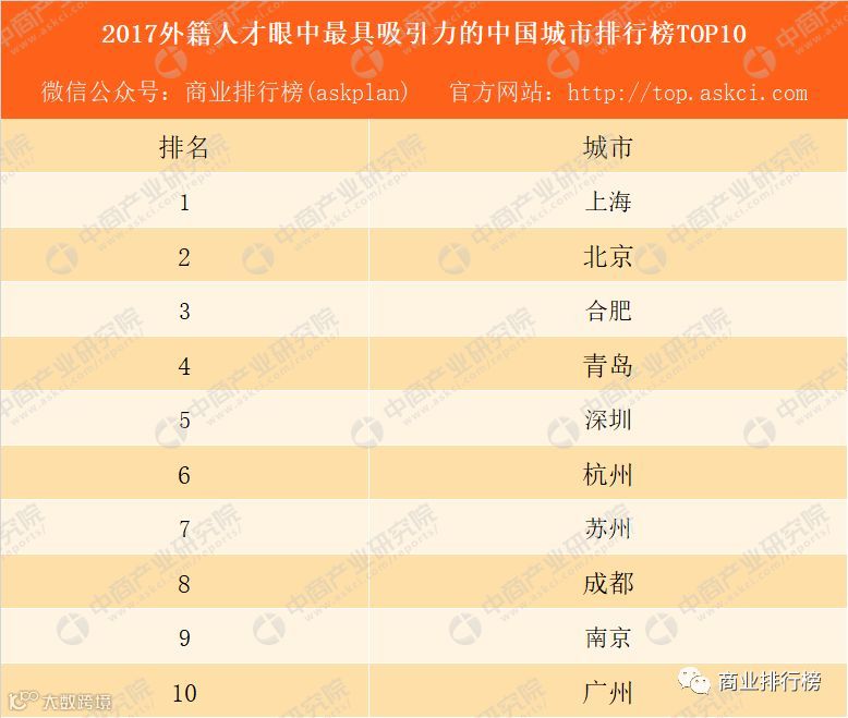 去年的该项榜单排名为:上海、北京、杭州、青岛、天津、深圳、苏州、广州、南京和长春。据悉,上海上海再次排名第一,实现了六连冠。近年来,上海深入贯彻落实聚天下英才而用之战略思想,实行更加积极、更加开放、更加有效的海外人才政策,加快构建具有全球竞争力的人才制度体系,先后出台“人才20条”、“人才30条”、人才高峰工程行动方案,积极推进外国人来华工作许可制度和外国人才签证制度试点工作,完善海外人才居住证制度,人才发展环境进一步优化,外籍高层次人才集聚度不断增强。