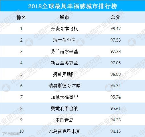 目前,2018第十七届全球国家(城市)竞争力分类优势排行榜榜单发布,会上发布了2018全球最具幸福感城市排行榜,分别是丹麦哥本哈根、瑞士伯尔尼、芬兰赫尔辛基、新西兰奥克兰、挪威奥斯陆、瑞典斯德哥尔摩、加拿大温哥华、奥地利维也纳、中国青岛和冰岛雷克雅未克,其中丹麦根本哈根排名第一。