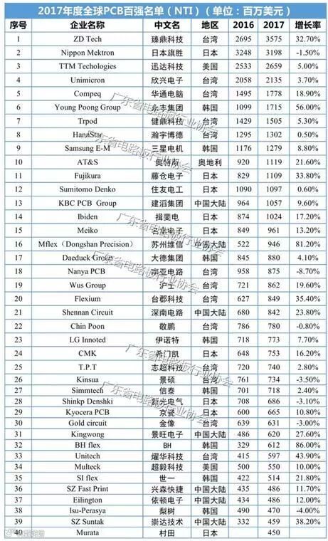 招商资源库近日,2017年度全球PCB100强榜单发布。据榜单显示:进入榜单前十的企业分别是: 臻鼎科技、日本旗胜、迅达科技、欣兴电子、华通电脑、永丰集团、健鼎科技、瀚宇博德、三星电机以及奥特斯。其中, 臻鼎科技位列榜首。