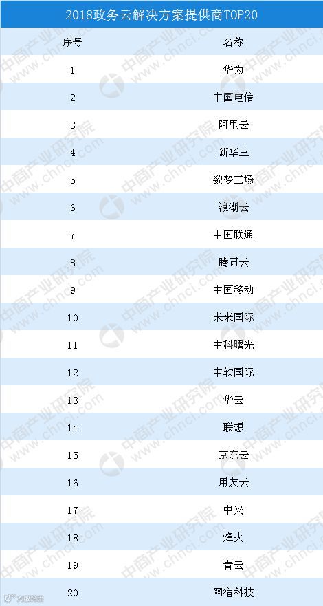 在2018年政务云解决方法提供商排行榜中,排名前十的提供商分别为华为、中国电信、阿里云、新华三、数梦工场、浪潮云、中国联通、腾讯云、中国移动、未来国际。