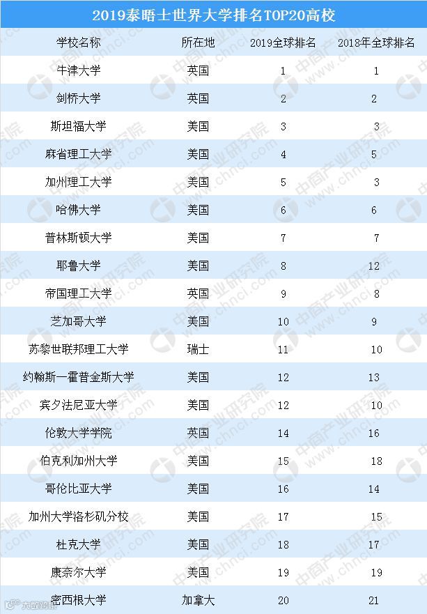 9月26日,泰晤士高等教育(THE)公布了2019年世界大学排名,在全球前20高校中,英国4所,美国14所,瑞士和加拿大各有1所。其中牛津大学连续第三年排名第一,同时在研究方面(数量、收入和声誉)高居榜首。剑桥大学保持第二,而美国斯坦福大学稳居第三。麻省理工学院名次上升一名,排名第四,但加州理工学院排名从去年的并列第三下降到第五位,但是该大学教学一项(学习环境)排名第一。耶鲁大学是前20名中名次提升最快的高校,上升四名,进入前10名,排名第八。耶鲁大学是前20名中名次提升最快的高校,上升四名,进入前10名,排名第八。