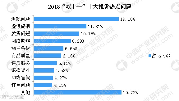 从2018“双十一”投诉问题来看:退款问题成为消费者们投诉重灾区,其投诉占比达19.10%;其次,虚假促销投诉排名第二,占比为11.81%;发货问题投诉则位列第三,投诉占比为10.18%。除此之外,网络欺诈投诉占比为8.29%,霸王条款投诉占比为6.66%,商品质量问题投诉占比为6.16%,售后服务问题投诉占比为5.15%,退换货难投诉占比为4.52%,网络售假问题投诉占比为4.27%,订单问题投诉占比4.15%,这些问题均为2018“双十一”10大投诉热点问题。