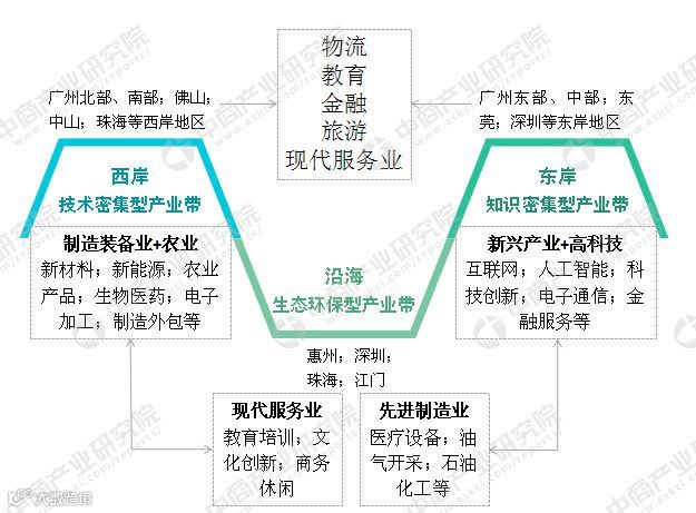 粤港澳大湾区一般分为湾区西岸、东岸以及港澳地区。目前,粤港澳大湾区西岸主要为技术密集型产业带,以装备制造业+农业为主。其中包括新材料、新能源、农业产品、电子加工等。东岸主要为知识密集型产业带,以新兴产业+高科技为主,其中包括互联网、人工智能、科技创新等。沿海则为生态保护型产业带,包括先进制造业、现代服务业。同时,东岸、西岸、沿海城市群加强联系与合作,优势互补,共同构建产业结构。