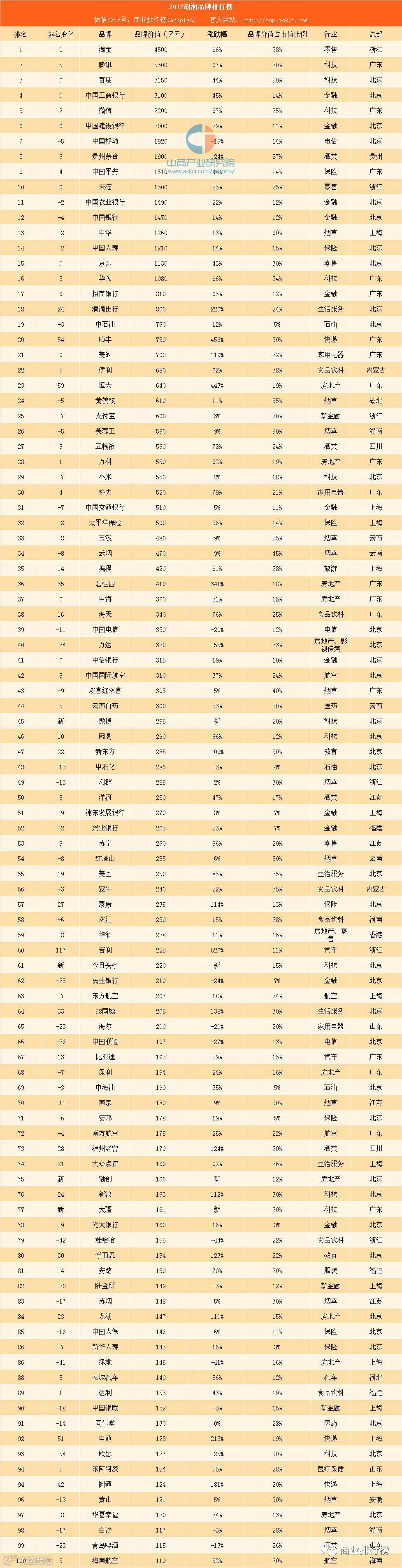 近日,胡润研究院发布《奥迪A8L典藏版·2017胡润品牌榜》,榜单显示,200强最具价值中国品牌中,非国有品牌114个,国有品牌89个。淘宝以4500亿元的品牌价值蝉联“最具价值中国品牌”;去年排名全国第五的腾讯今年以3500亿元的品牌价值跃居全国第二;百度以3150亿元保持全国第三。