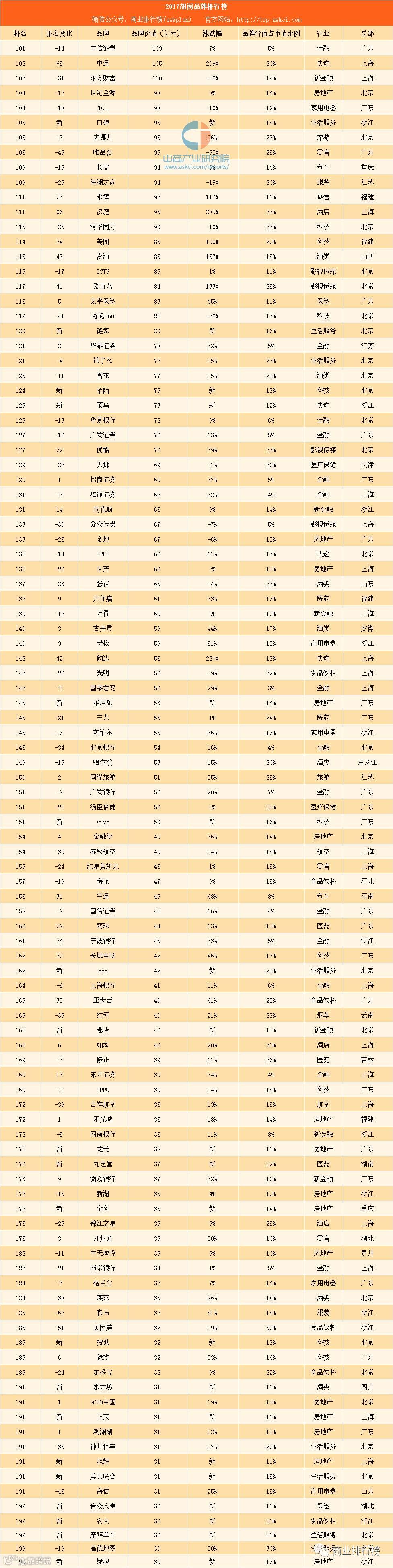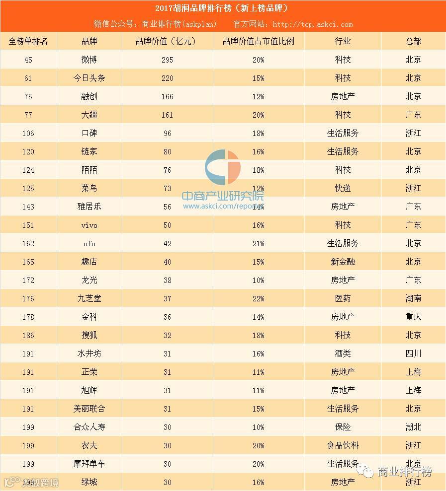 今年新上榜品牌共计24个,新上榜品牌Top10分别为:微博、今日头条、融创、大疆、口碑、链家、陌陌、菜鸟、雅居乐、vivo 。从行业来看,金融、房地产仍然是上榜品牌数量最多的两个行业,金融业今年有43个品牌上榜,与去年持平;房地产行业今年有26个品牌上榜,比去年增加3个,这两个行业的上榜品牌数量占到了整张榜单的34%;科技行业保持第三,有20个品牌上榜,比去年增加5个。生活服务行业今年有12个品牌上榜,比去年增加5个,新进入上榜品牌数量最多的十大行业中。胡润表示:“新经济在改变我们的生活。今年科技和生活服务品牌增加最多,从中也能看出新经济类的品牌正在深度改变我们的生活。”