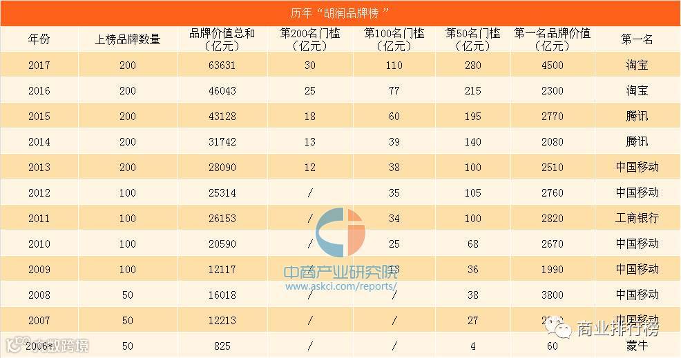此外,200强品牌价值上榜门槛也达到历年最高。200强上榜门槛为30亿元,比去年提高20%。百强的上榜门槛为110亿元,比去年提高43%。品牌价值超过1000亿元的达到16个,比去年增加3个。