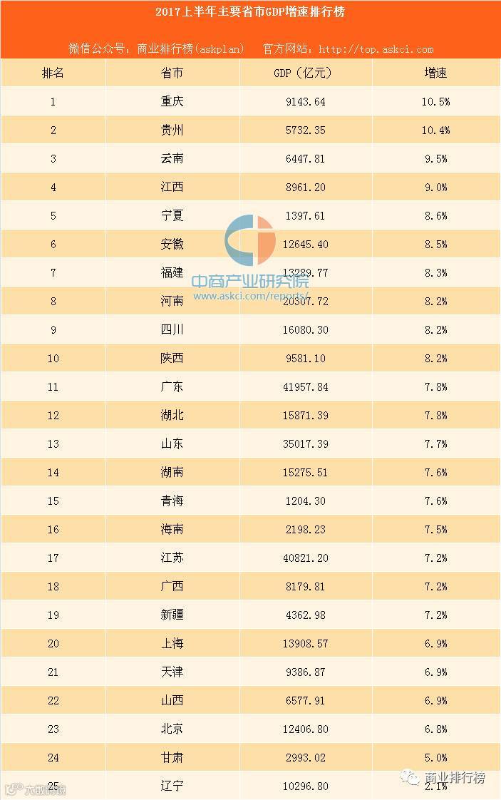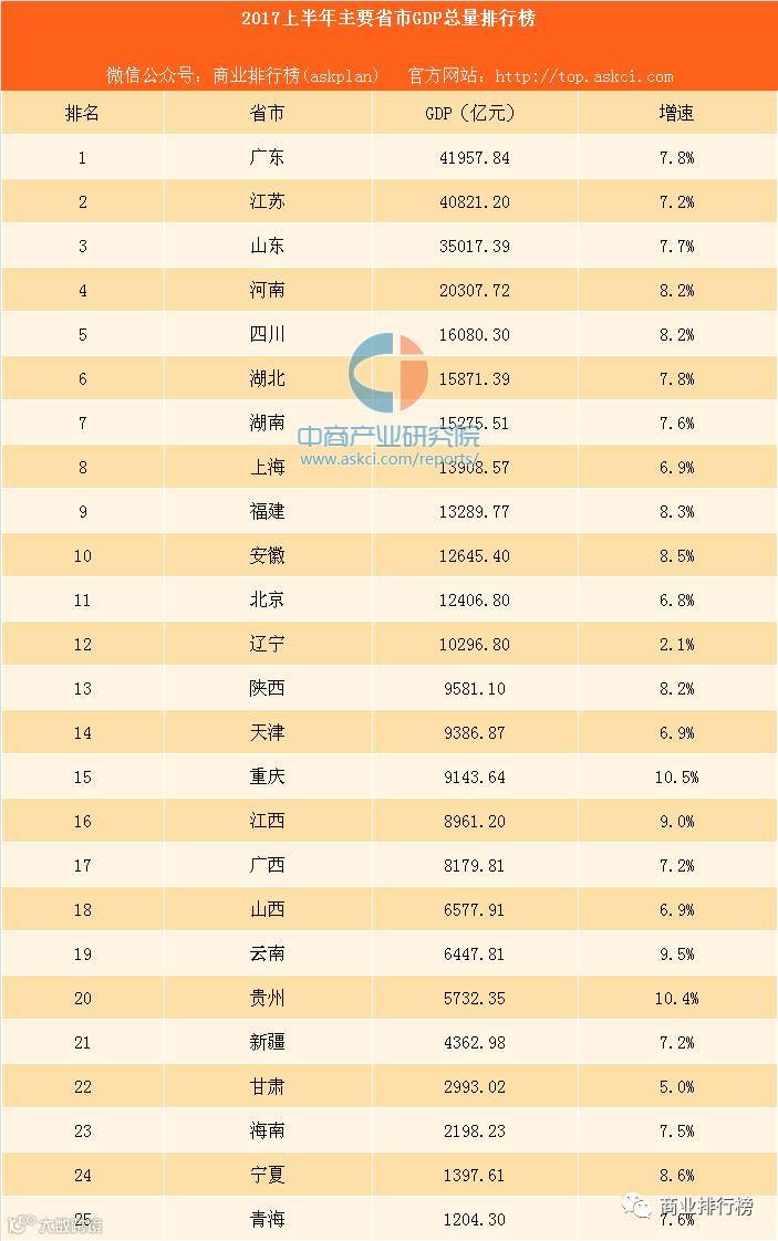 目前有25个省市已经发布了2017年经济半年报,广东、江苏、山东GDP总量位列前三甲,重庆上半年GDP增速达10.5%,居25省份之首,辽宁GDP增速垫底,仅2.1%。另外,仅北京、甘肃、辽宁三省市GDP增速低于全国平均水平(6.9%)。