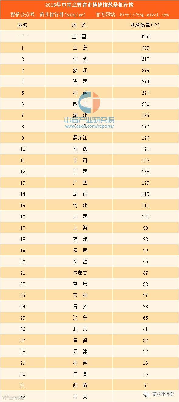 截至2016年年底,中国博物馆共有4109个,博物馆数量超100个的省市有16个,其中山东、江苏、浙江、陕西、河南、四川博物馆数量超200个。山东省博物馆数量最多,共有393个。江苏有275个,浙江275个。经济大省广东博物馆建设则较为落后,仅177个。
