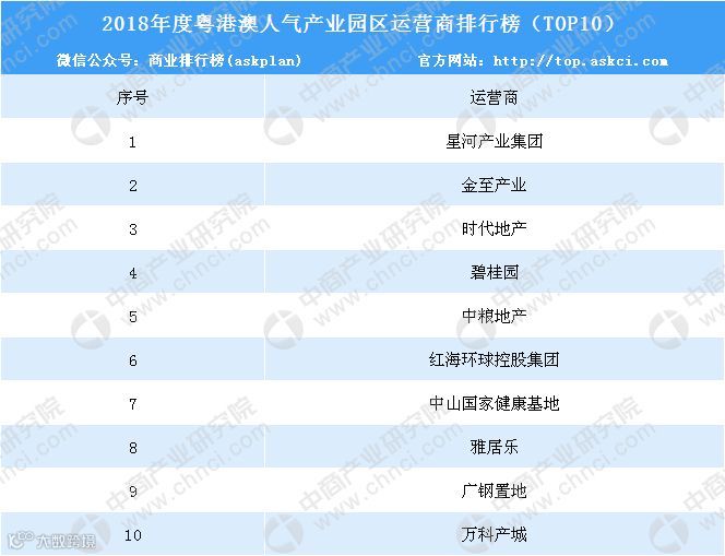 此外,本次会上还发布了2018年度粤港澳人气产业园区运营商排行榜,以下为具体榜单:
