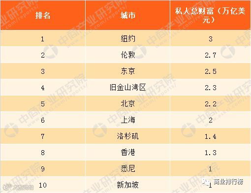 全球最富有的10个城市中,每个城市的私人财富至少达到1万亿美元。北京、上海、香港分列第五、第六位和第8位私,人总财富分别达2.2万亿美、2万亿美元和1.3万亿美元,值得一提的是,深圳的财富总额7700亿美元,略微少于排在第15名的巴黎,遗憾地与前15名擦肩而过。纽约名列第一,私人总财富达3万亿美元。
