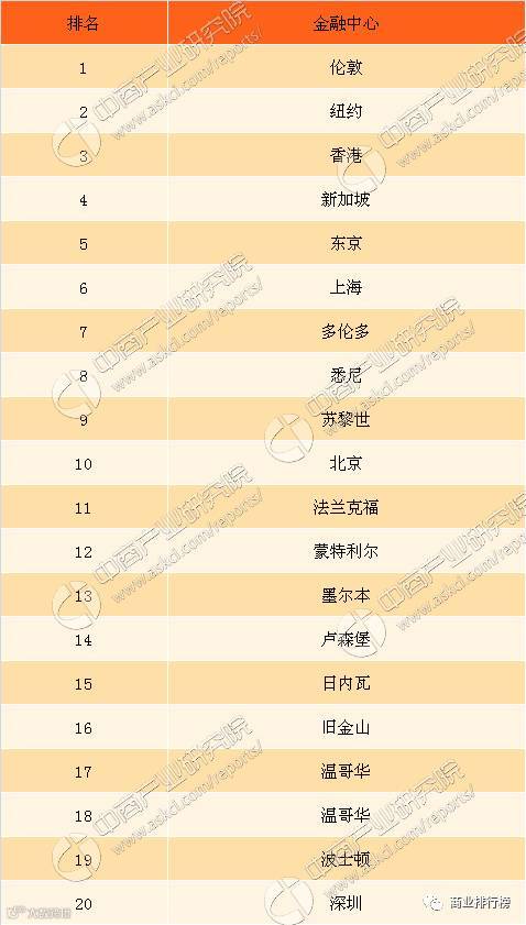 全球金融中心排行榜TOP20