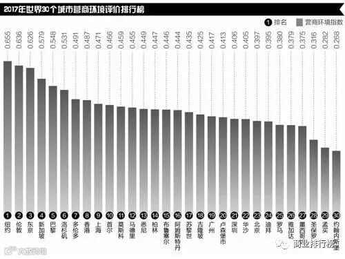 日前,粤港澳大湾区研究院发布了《2017年世界城市营商环境评价报告》。据报告显示,在参与营商环境排名的30个世界城市中,前十名分别是纽约、伦敦、东京、新加坡、巴黎、洛杉矶、多伦多、香港、上海、首尔;排名末五位的是雅加达、墨西哥城、圣保罗、孟买、约翰内斯堡。此外,广州、深圳、北京分别为全球第十九、二十一、二十三名。