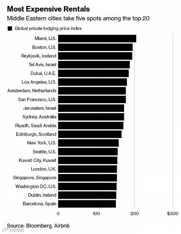 彭博社近日发布的全球Airbnb消费指数(WorldAirbnbCostIndex)显示,迈阿密和波士顿的单晚价格已经连续两年位列世界各大城市之首。这两座城市在Airbnb上每晚的价格分别是205美元和194美元。与此同时,中东地区的排名也在今年大幅上升,其中有5个中东城市跻身前15。特拉维夫和迪拜分别位列全球最贵城市的第四、第五位,耶路撒冷、利雅得和科威特的排名也很靠前。