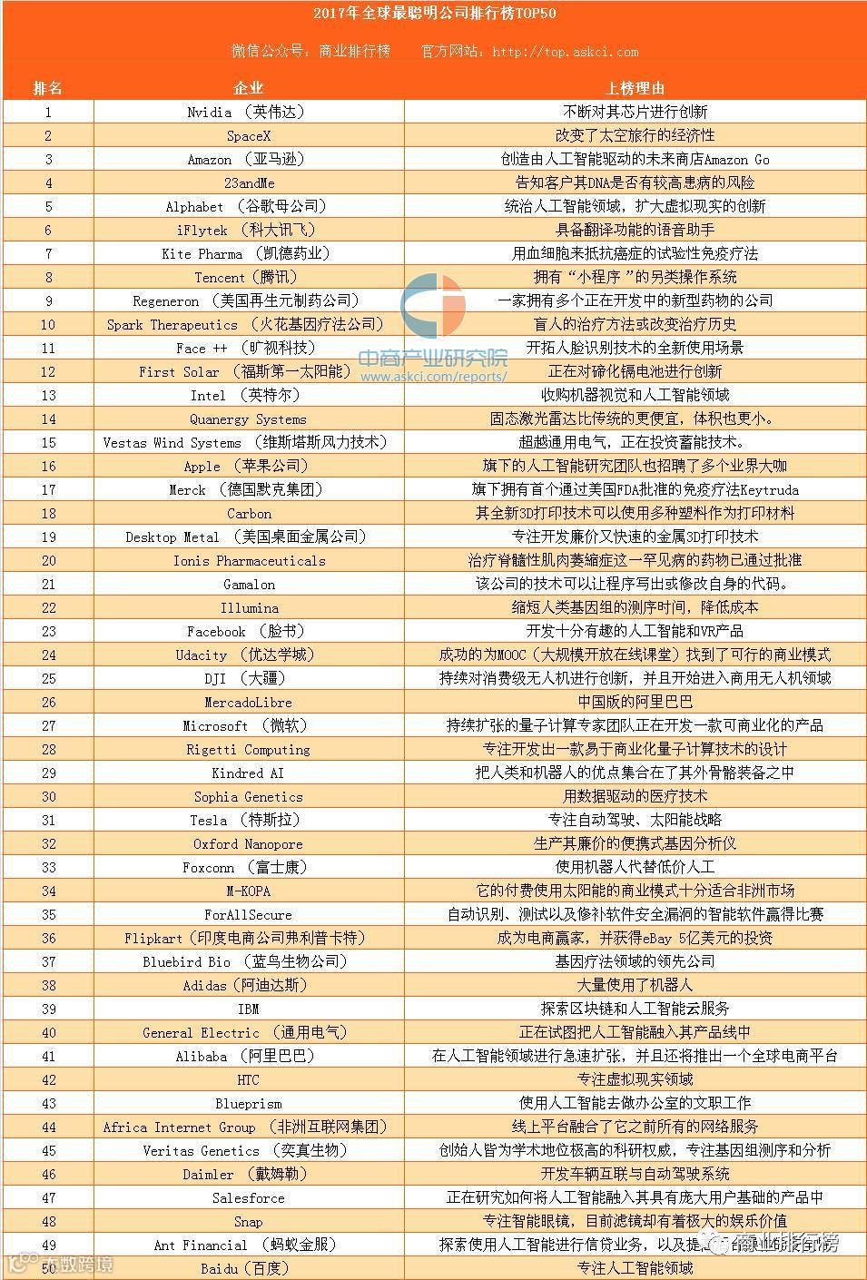《麻省理工科技评论》考察的两大必要条件:该公司的科技领军能力,以及商业敏感度。上榜的 50 家公司是“高精尖科技创新”与“能够保证公司的利益最大化的商业模式”的完美融合。