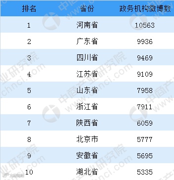 截至2018年6月,中国大陆共有31个省、自治区、直辖市开通政务机构微博。其中,河南省共开通了10563个政务机构微博,居全国首位,其次为广东省,共开通微博9936个。