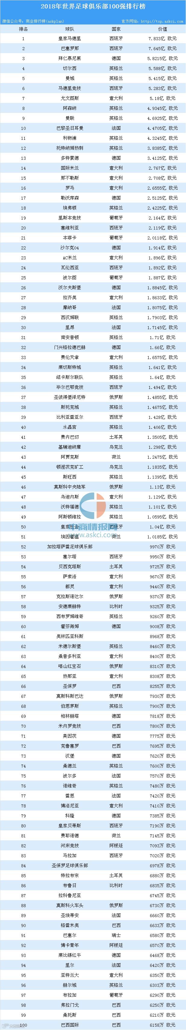 近日,2018年世界足球俱乐部100强榜单出炉。据榜单显示:进入2018年世界足球俱乐部100强榜单前十球队分别是:皇家马德里、巴塞罗那、拜仁慕尼黑、切尔西、曼城、马德里竞技、尤文图斯、阿森纳、曼联和巴黎圣日耳曼。其中,皇家马德里以7.833亿欧元的价值位列榜首;其次,巴塞罗那紧随皇家马德之后,价值为7.645亿欧元。值得注意的是,2018年世界足球俱乐部100强的前11个球队的价值均超4亿欧元;而排名前两名的球队价值均超7亿欧元。2018年世界足球俱乐部100强排行榜具体排名情况如下: